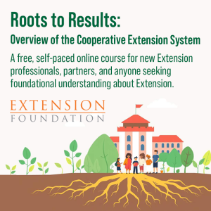 The Extension Foundation is excited to announce the launch of a new self-paced online course: “Roots to Results: Overview of the Cooperative Extension System.” This course is open to anyone who wants to better understand Cooperative Extension, whether you’re new to the system, need a refresher, or are working with Extension in a partnership role.